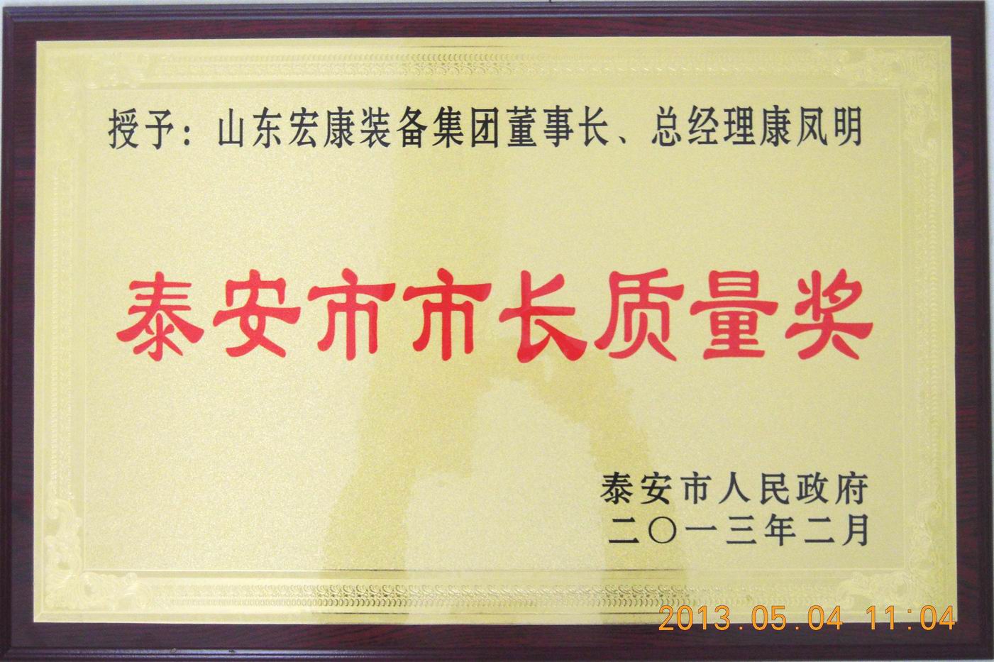 近日,泰安市人民政府下發《關于表彰獎勵2012年度泰安市市長質量獎獲獎單位和個人的通報》(泰政函【2013】15號)文件,集團董事長、總經理康鳳明被授予2012年度“泰安市市長質量獎”,并受到獎勵。