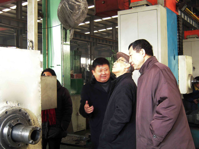 1月11日,中國機械工業聯合會特別顧問朱森第(右二)、山東省機械工業協會副會長關風森(右一)等專家和領導來公司視察指導工作,對公司的產品結構調整特別是數控機床項目進行了指導。圖為公司董事長、總經理康鳳明陪同參觀視察,向其介紹數控機床項目。