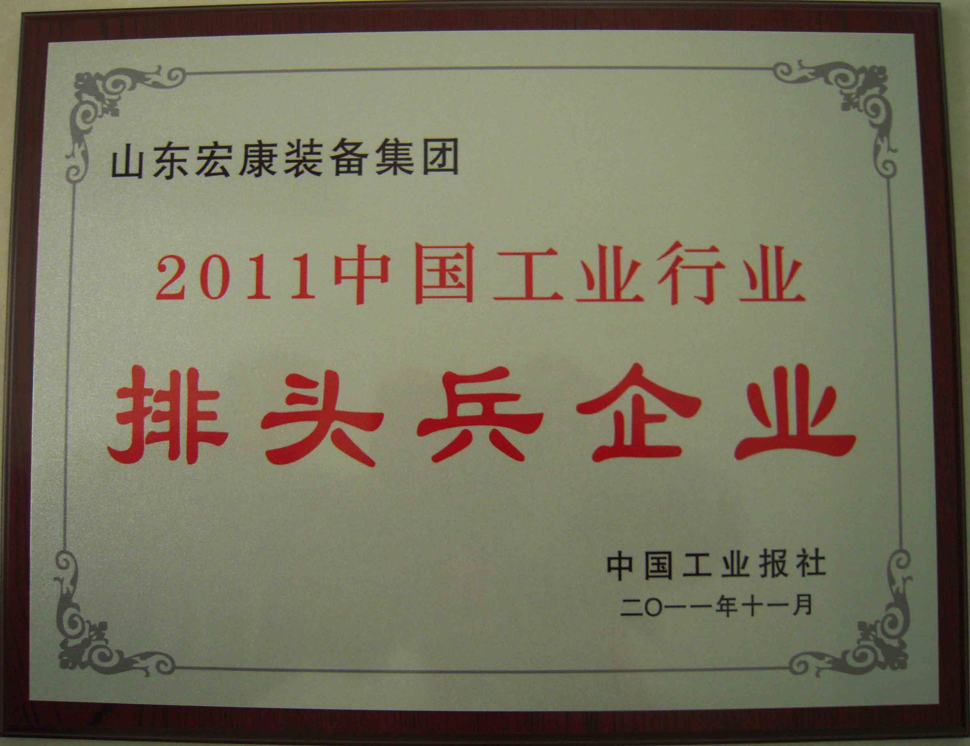 2011年11月8日,“2011中國工業行業排頭兵企業名單”隆重發布,山東宏康裝備集團成功入選2011年中國金屬成形機床制造行業排頭兵企業名單,同時榮獲“科技創新”和“行業新星”兩個單項獎。